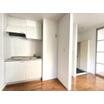 洋間とキッチンフロアはフラットな床面でつながり、仕切り戸も光を通すデザインなので抜け感アリ!洋間は使い方に個性が出そうな間取りの形!洋室にもDKにもエアコン完備なので、エアコン準備など初期投資をおさえた展開が可能です!
